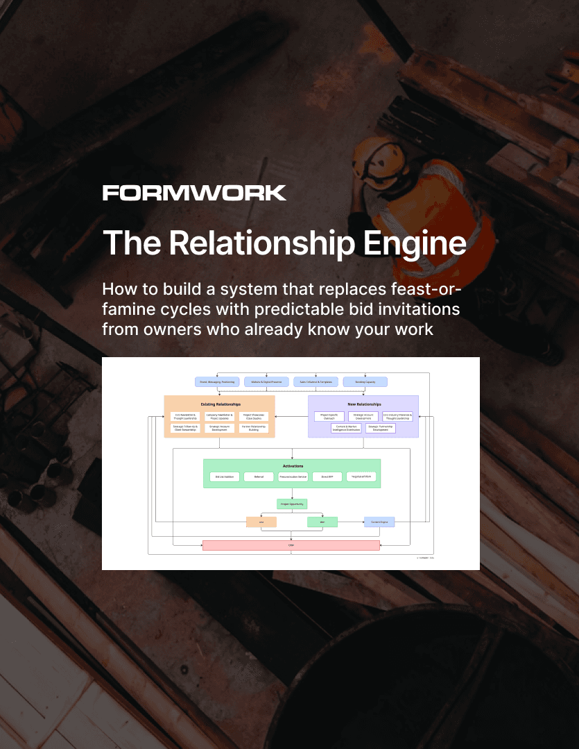 In 96 pages, learn the exact system we set up for commercial GCs that builds key relationships with owners and developers, keeps clients engaged systematically, and adds consistent high-quality opportunities to their backlog.